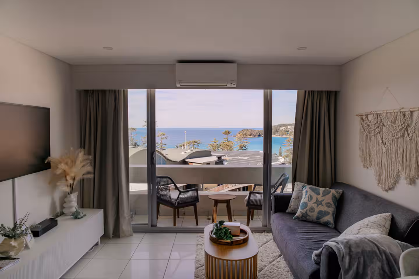 Modern 1-bedroom apartment on the 8th floor in the heart of Manly, offering stunning beach and ocean views. Everything is brand new — from the stylish furnishings to the comfy queen bed and fully equipped kitchen. Relax on the balcony, enjoy the sea breeze, and soak up the coastal lifestyle. Includes free parking, fast Wi-Fi, and air conditioning in the loungeroom.