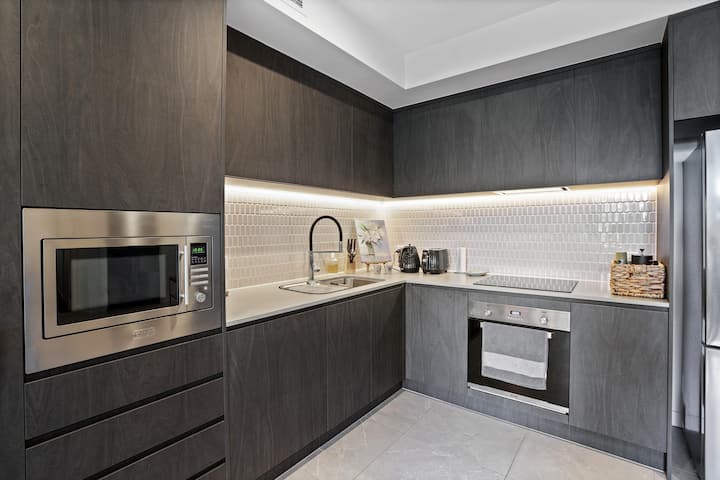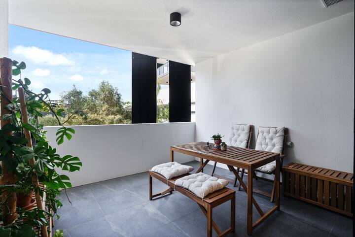 Living & DiningRelax in the beautifully styled lounge area with a Smart TV and Netflix access. Enjoy meals at the timber dining table or step outside to your private balcony—complete with outdoor seating and greenery, perfect for morning coffee or evening wind-downs.